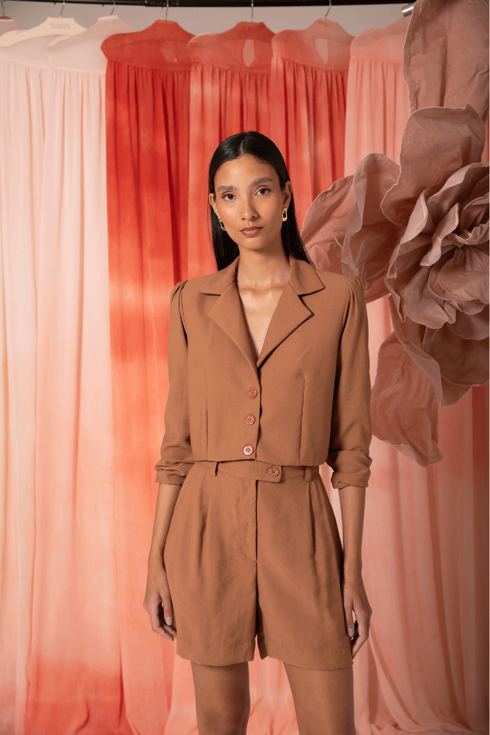 BLAZER CROPPED THALITA com modelagem moderna e elegante. Possui gola com lapela clássica, forro interno, fechamento frontal por botões e mangas longas com leve volume nos ombros, trazendo um toque de estilo à peça. O comprimento mais curto valoriza a silhueta e combina perfeitamente com peças de cintura alta, criando um visual atual e versátil.
