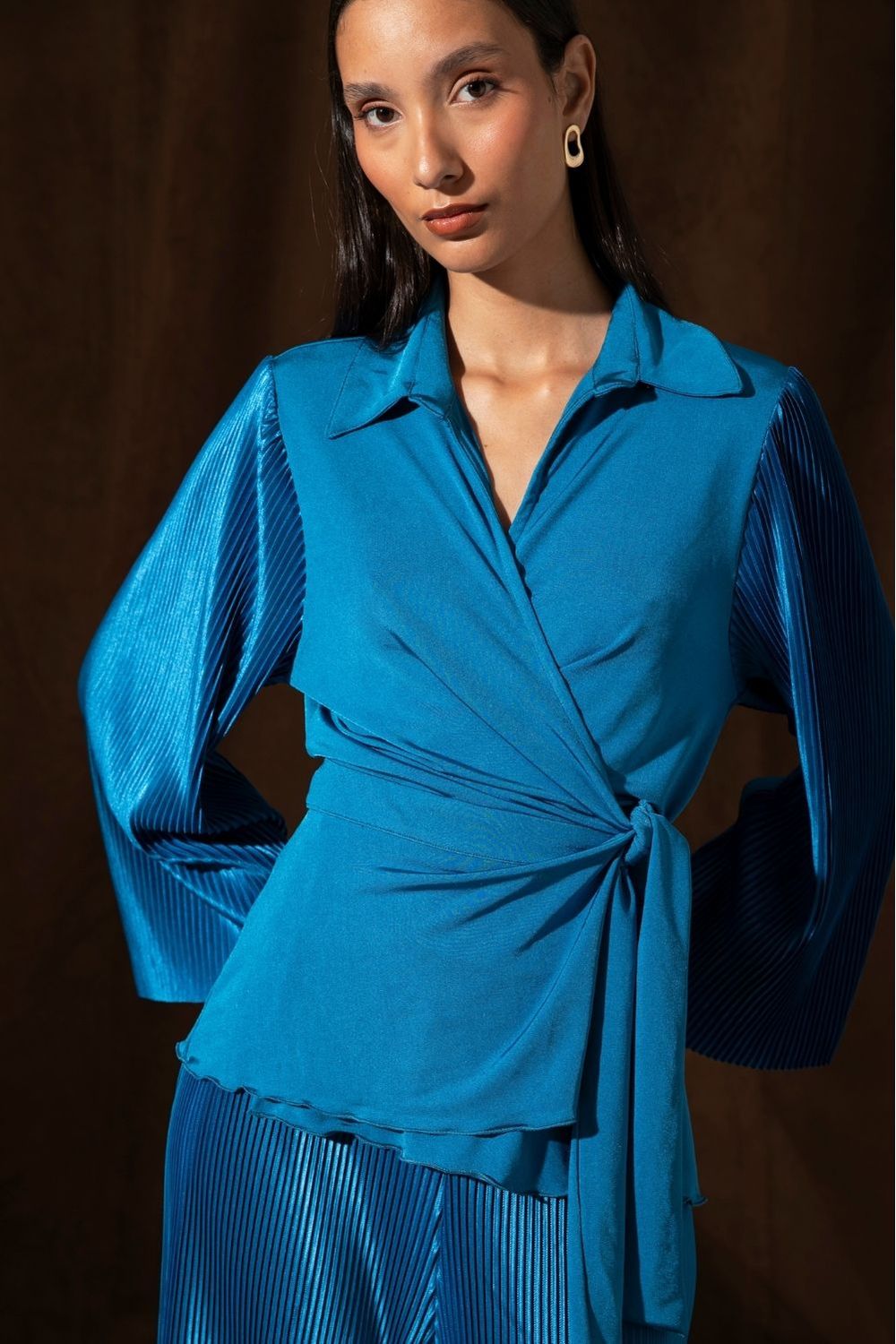 A Blusa Emy é confeccionada em tecido leve. A peça possui decote v com gola , manga plissada, amarração na cintura e comprimento regular.