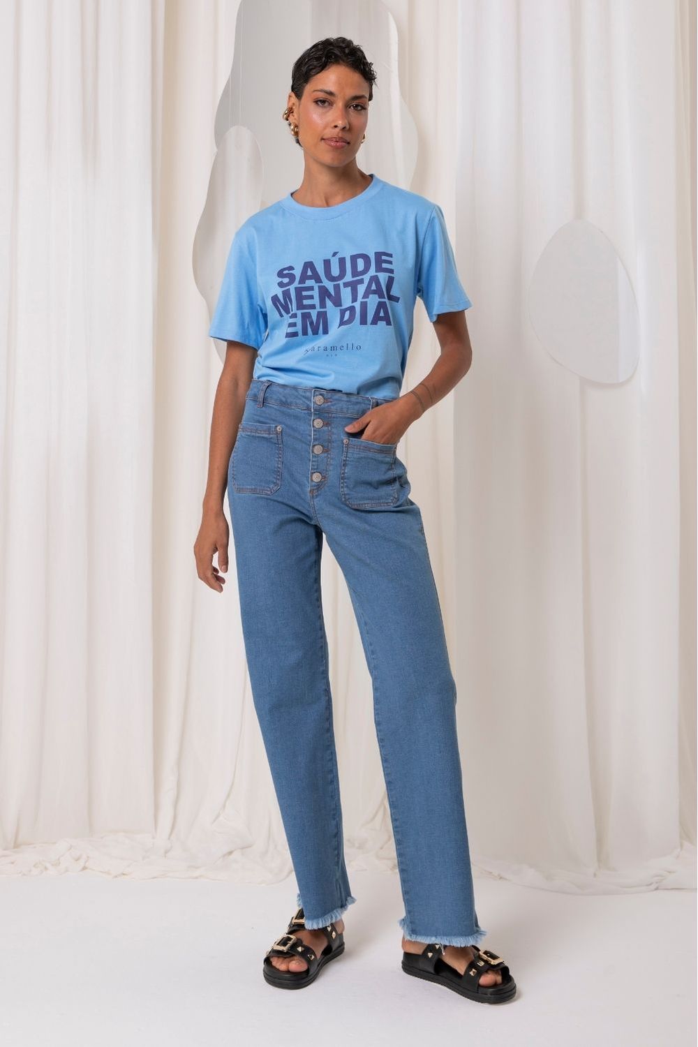 A calça jeans c/ botoes é confeccionada em tecido leve . A peça possui cintura alta, cós aplicado com passantes, bolsos frontais e fechamento por botoes.
