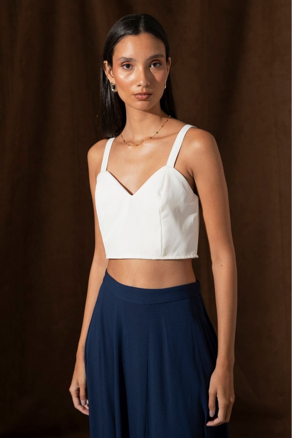 O top Jessie é confeccionado em tecido leve . A peça possui decote coração, modelagem ajustada, comprimento medio e fechamento em ziper nas costas