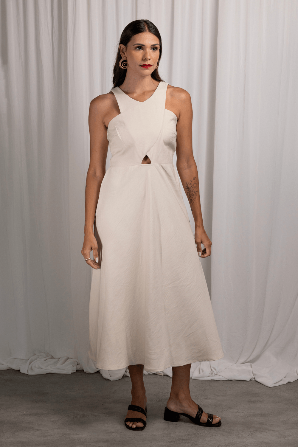 VESTIDO FAFA Possui decote assimétrico, recorte frontal delicado, fechamento em zíper nas costas e comprimento midi.